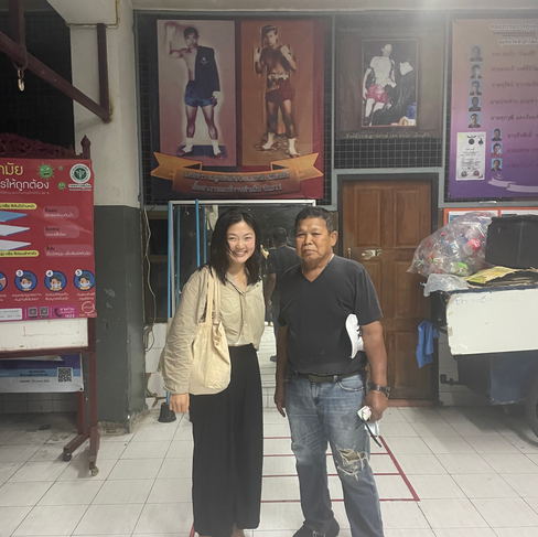 I figured this was probably a great opportunity to practice my Thai, so I mustered up some courage and proceeded to speak to him with my broken Thai and horrible accent. "It's raining a lot," I said in Thai, and he smiled, nodding. We then proceeded to have a choppy, partially comprehensible conversation in Thai, where I used practically every phrase and sentence I've ever learned, with a bit of extra assistance from Google Translate. I learned that his nickname is Singhao, he's a police officer, he's been a police officer for 40 years, and he's 77. I learned that he's been to America, and his eldest daughter now lives in America after opening a Thai restaurant there. I told him about coming to Thailand to teach English. I told him that I would be staying in Kalasin for a year, and he started calling me "my Kalasin friend!" The most Thai vocab that I have is food-related, so I started peppering him with questions about food– about his favorite food, what cuisines he liked, if he could eat spicy foods, and what restaurants he recommended. He asked if I liked Pad Thai, and when I said chop maak! or I like it very much, he called out to a street vendor across from us for an order of Pad Thai, mai phet, not spicy. The woman across the street brought over a steaming plate of noodles, and when I tried to pay, Singhao insisted on paying. He watched me take my first bite, and when I looked up and said aroi maak! or so delicious, his entire face lit up. He laughed and gestured for me to eat. The Pad Thai was genuinely so delicious; it's probably my favorite meal here so far, and for once, I could handle the spice level. As I ate, I pulled out Google Translate again, trying to learn a bit more about Singhao. And that's when I found out that he was a professional Muay Thai fighter! I struggled to understand what he said most of the time, but when he put his fists up, I finally got it. He showed me pictures of when he was 20, winning a Muay Thai championship and taking a photo with the ninth king of Thailand. King Bhumibol the Great was literally the person who awarded him his championship. And that's when I realized that I'm now twice removed from the greatest king of Thailand.